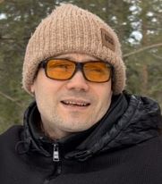 Kasvokuvassa hymyilevä mies, jolla on päällä musta, hupullinen toppatakki, oranssit aurinkolasit ja hiekan värinen neulepipo.